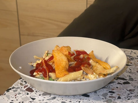 500g Penne – pasta penne, 3dl grädda svensk, 50g Parmigan oregono ost, 6st Äggulor(några vita också), Frysta ärtor 200g Svenska ärtor(på känsla), Lite mellan mallen svart peppar, 20g salt i pasta vattnet, 30g saltchips Redhead, 75g Redhead Bacon. Tjortta ner allt i en stekpanna. Tillsätt pastan på med extra Redhead Bacon om du gillar Bacon. Servera och njut!